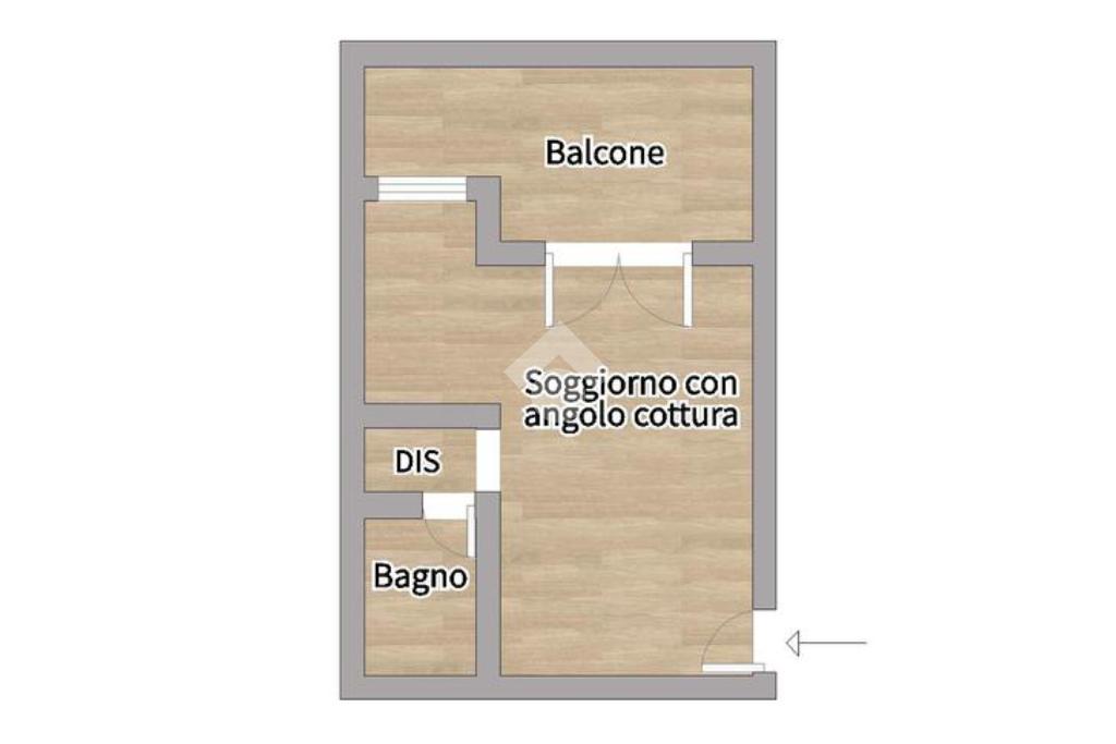 L’ingresso apre su un soggiorno con angolo letto ben organizzato, affiancato da un angolo cottura pratico e funzionale. Un disimpegno conduce al bagno cieco dotato di box doccia.